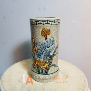 ỐNG cắm hương men rạn đắp sen cao 18 cm