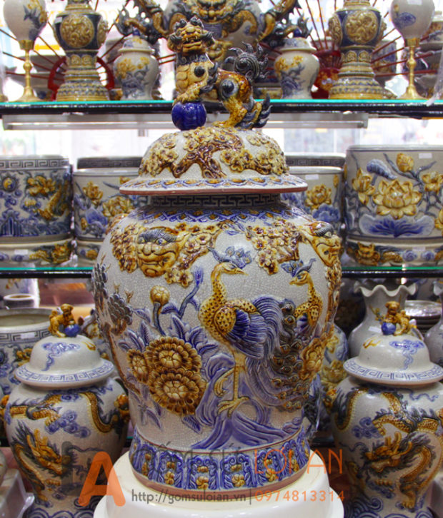 | Loại sản phẩm | Đôi Chóe men rạn 20l đắp công , hoa đào, tùng cao 60cm |