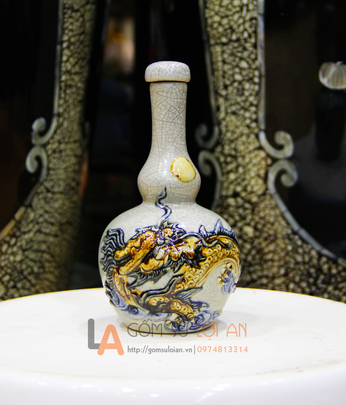 | Loại sản phẩm | Nậm rượu số 1 2 bầu men rạn đắp rồng cao 21 cm |