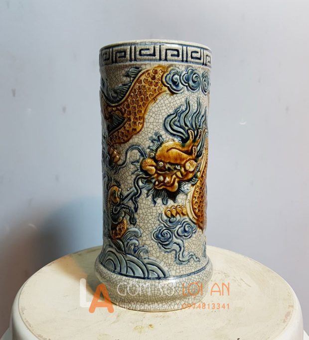 Ống hương thờ đắp rồng men rạn cao 24cm