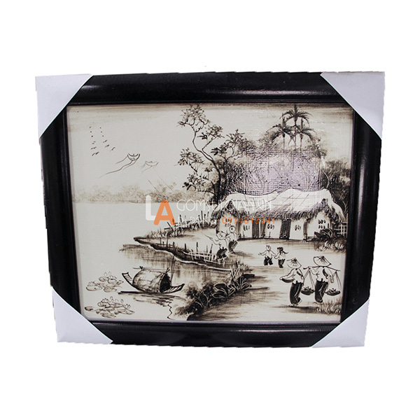 Tranh sứ Làng quê mẹ con bên bến nước
